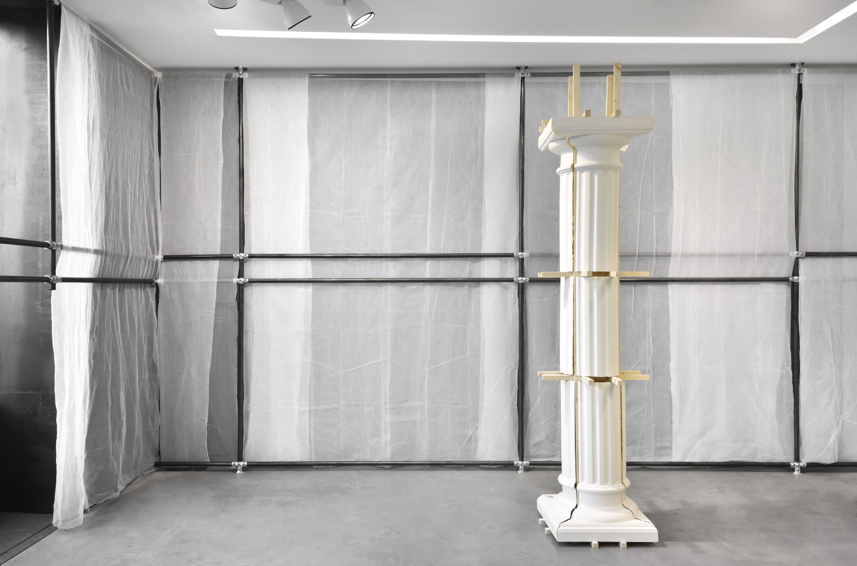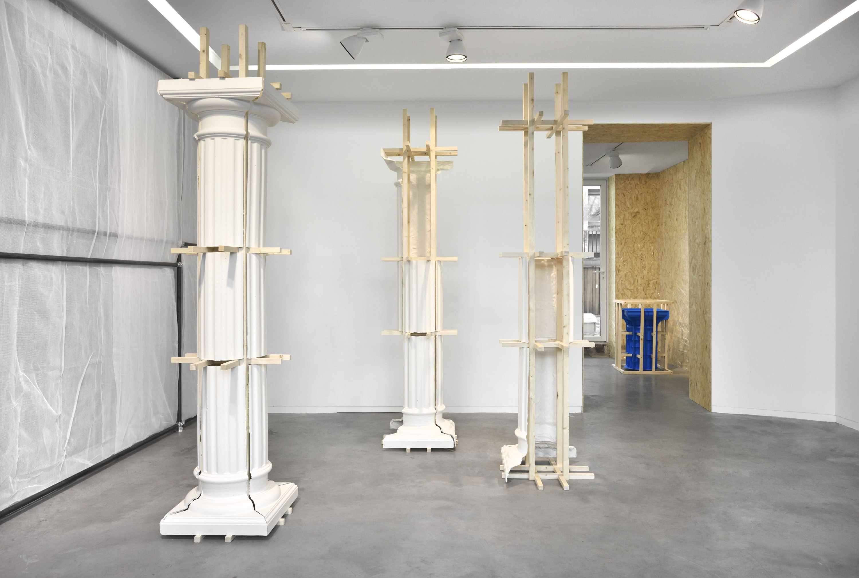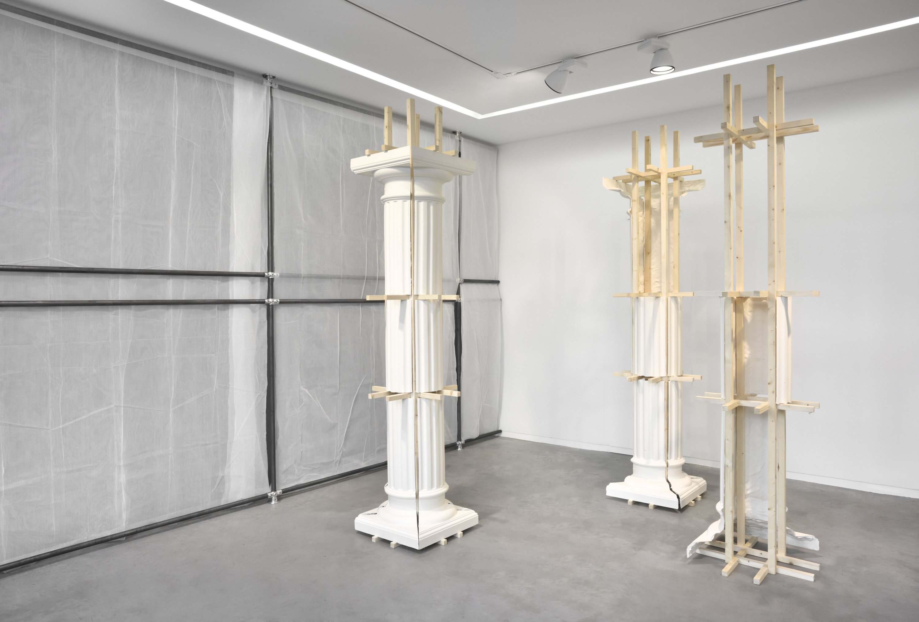 Lorsque, dans d’autres cas, Cyril Zarcone ne reprend que la forme et que la reconstruction passe par d’autres matériaux que ceux d’origine, comme le papier, le plâtre ou encore le polystyrène expansé, il se joue des faux-semblants et l’on se laisse surprendre par la fragilité de ses sculptures qui, une fois qu’on les a approchées, ne soutiennent rien, ne portent plus et bien souvent sont elles-mêmes maintenues par ce qui les entoure.