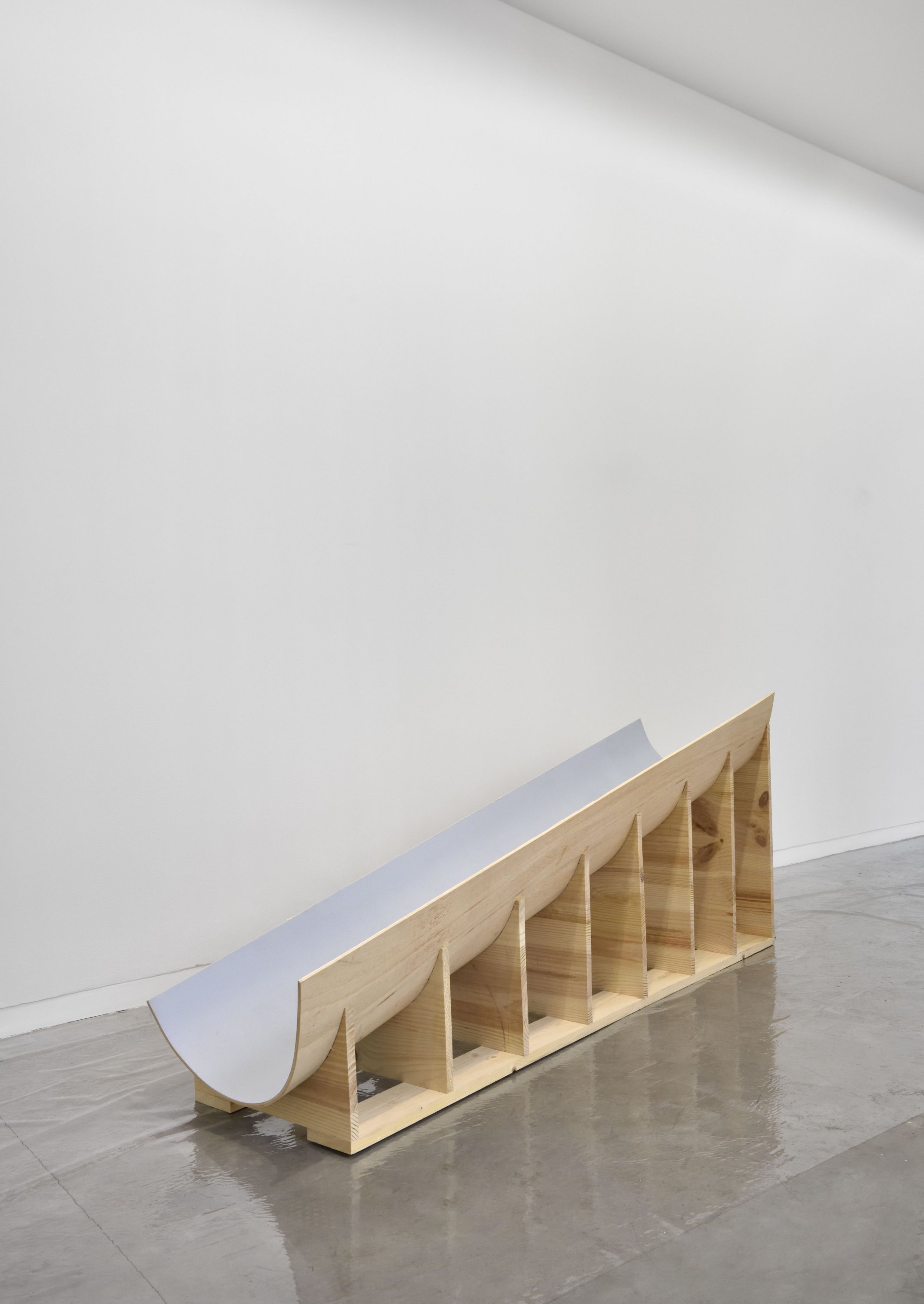 Ces substitutions de matériaux poussent encore un peu plus loin le dépouillement utilitaire de la forme créée par l’artiste et l’annihilent complètement. Cyril Zarcone nous oblige alors à nous confronter à cette forme dans ce qu’elle a de plus primaire. En 2011, il réalise « Contre-Fiche », une structure d’étaiement de cinq mètres de haut en polystyrène extrudé qui n’étaiera que la nature de sa forme, car en réalité c’est le mur sur lequel cette sculpture est appuyée qui lui sert de soutènement.
